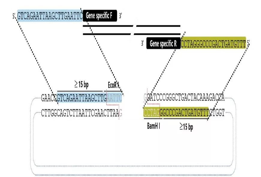 在基因克隆的引物设计及目的DNA片段的扩增阶段,与常规PCR法是相同的。唯一的差异在于载体末端和引物末端应具有15-20个同源碱基,由此得到的PCR产物两端便分别带上了15-20个与载体序列同源性的碱基。